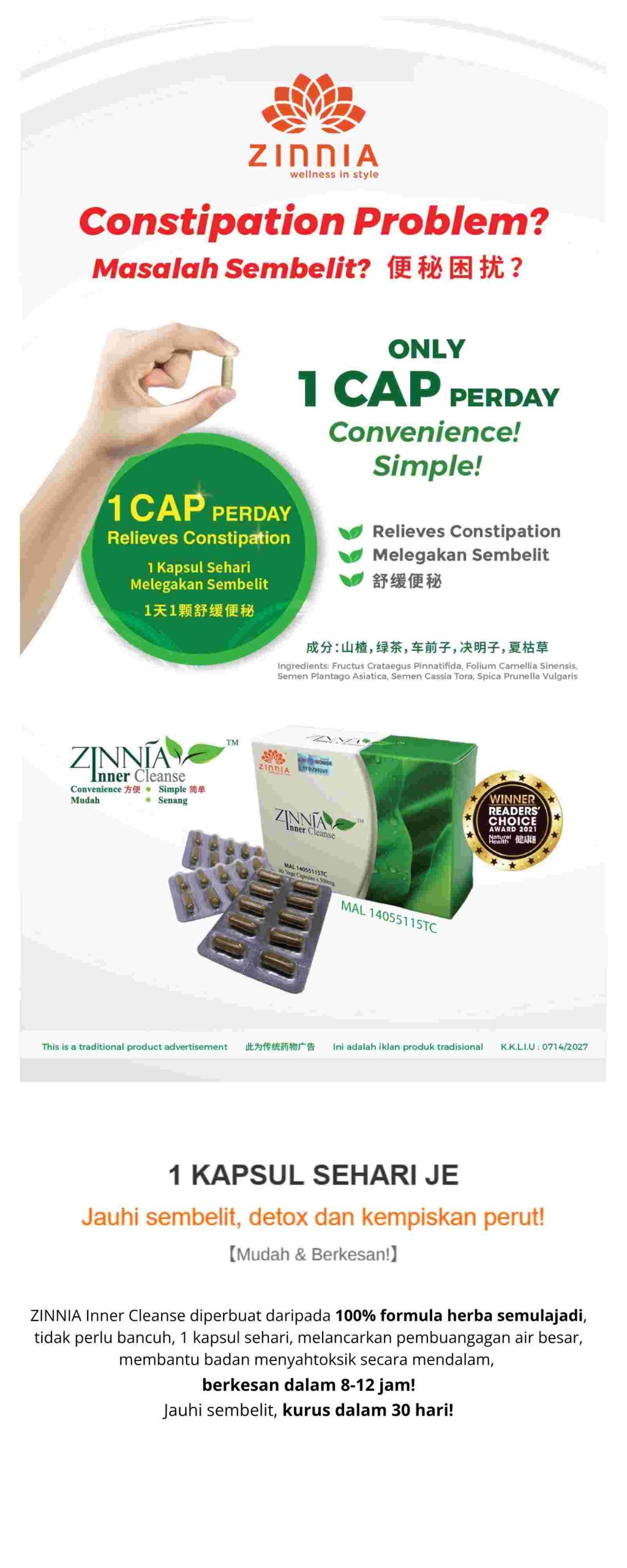Jika ada reaksi seperti ini, biasanya ia menunjukkan bahawa seseorang itu mempunyai sistem pencernaan yang sensitif. ZINNIA Inner Cleanse mengandungi fitonutrien semula jadi dan pelbagai vitamin yang membantu menggalakkan pergerakan usus, memulihkan fungsi pencernaan, dan mempercepatkan proses penghadaman. Bagi individu yang sensitif terhadap saluran gastrousus, pada peringkat awal pengambilan, terdapat kemungkinan reaksi pemulihan seperti pergerakan usus yang signifikan, kentut yang kerap, atau mengalami sembelit. Ini adalah reaksi pemulihan yang normal kerana dalam proses menggalakkan metabolisme toksin, ia boleh menyebabkan regangan, pergerakan yang kerap, atau kekakuan pada selaput usus. Disarankan untuk terus mengambil suplemen ini untuk membantu mengatur fungsi usus, membuang toksin yang terkumpul dalam badan, dan memperbaiki masalah usus sensitif. Dalam tempoh ini, disarankan untuk mengurangkan pengambilan makanan berminyak dan pedas, pastikan pengambilan air yang mencukupi lebih kurang 2.5 liter sehari, dan minum air secara berulang kali dalam jumlah yang sedikit untuk mempercepatkan metabolisme dan mempercepatkan proses pemulihan.