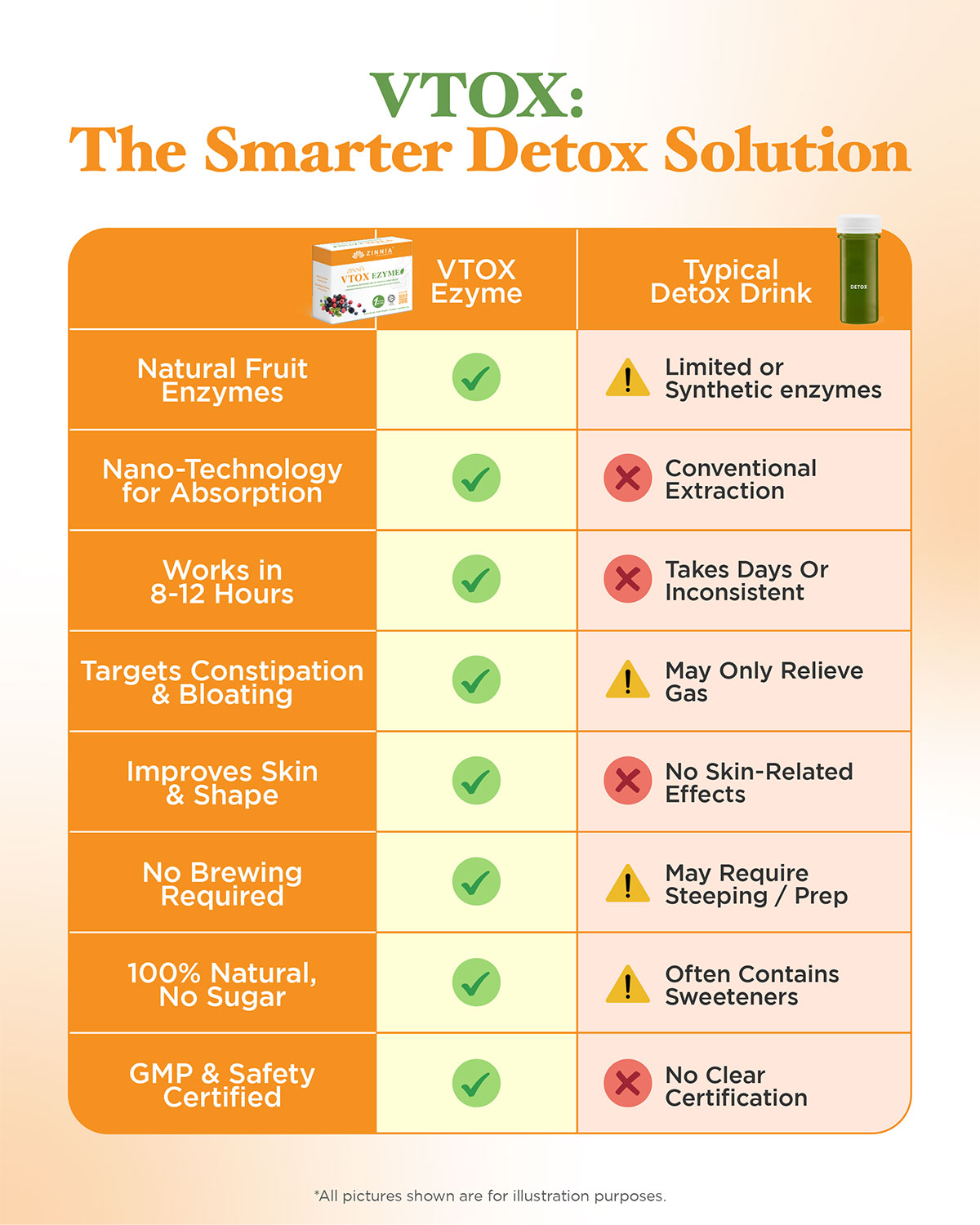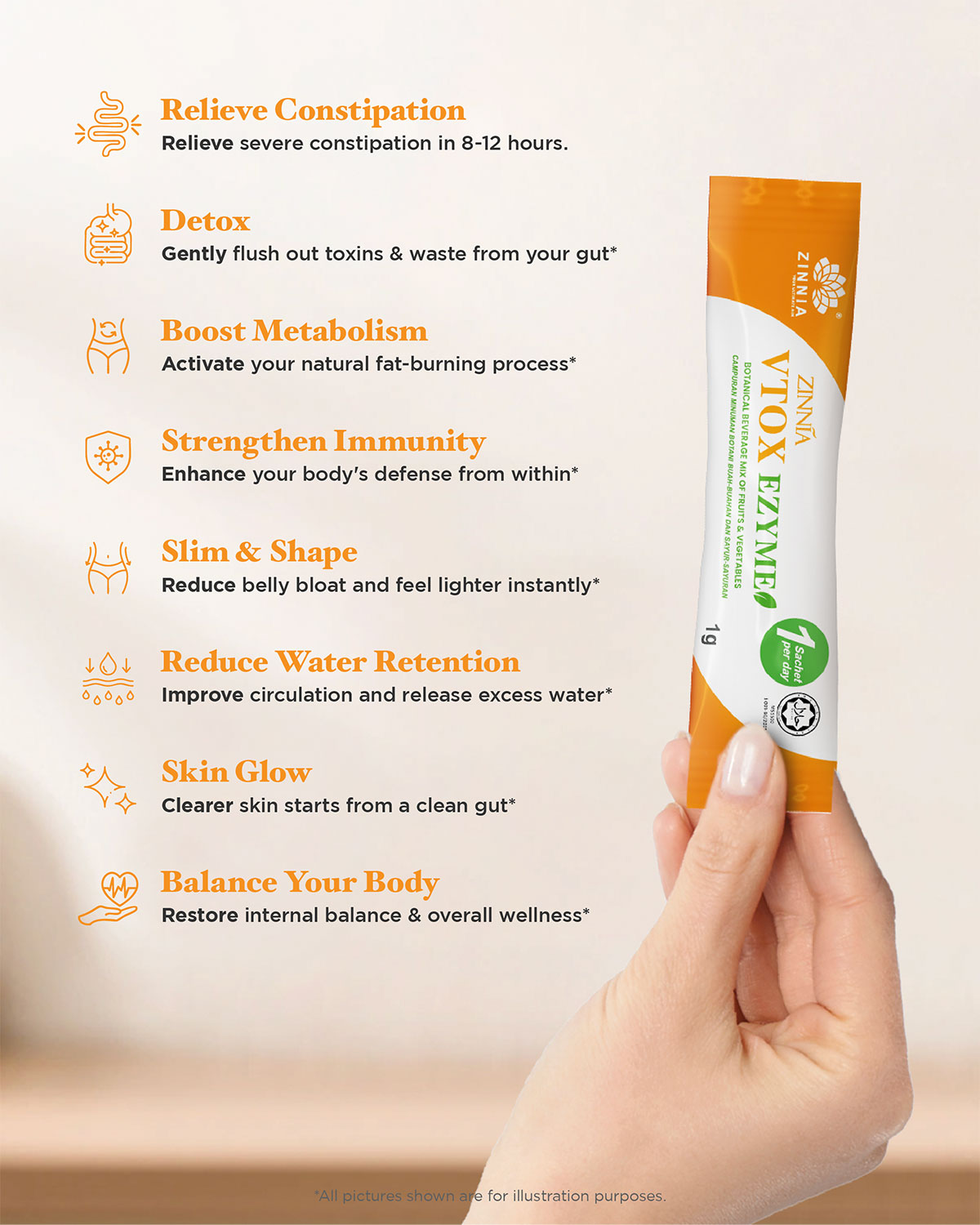 ZINNIA VTOX EZYME is made from a unique mix of enzymes, plant extracts, and superfoods — designed to help your body eliminate waste, rebalance digestion, and feel lighter each day. Our 7 natural ingredients deliver results naturally and gently.